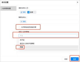 在会议设置中取消勾选“允许成员发起共享”,开启成员入会时静音,点击保存。设置完成后点击完成,如下: