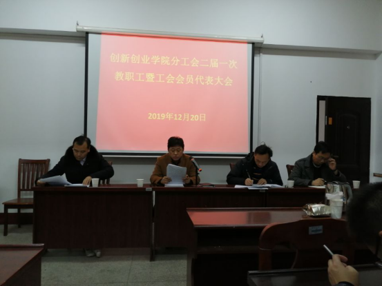 2019年12月20日下午,创新创业学院在学院301会议室隆重召开我院分工会二届一次教职工暨工会会员代表选举大会(以下简称“双代会”)。学院党政领导班子成员、学院全体教职员工39人参加本次大会,大会由院党委书记胡和平主持。