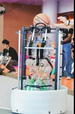 (图左为研制的运球机器,图右为研制的投篮机器)