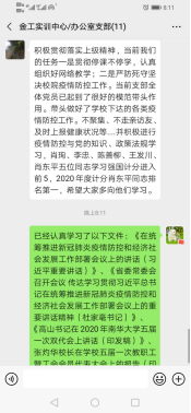 ①各位党员主动学习了习近平总书记和杜家毫书记关于推进新冠肺炎疫情防控和经济社会发展工作部署会议上的讲话原文,积极配合宣传防疫工作,并参与讨论,让更多的群众了解如何打好这场疫情防控阻击战。②学习了高山书记和张灼华校长的讲话,积极参与学校建设,贡献自己的一份力量。③各位党员通过学习强国不断加强自身学习,肖珣、李忠、陈善柳、王发川、肖东平五位同志学习强国积分进入支部总积分前5,2020年度积分肖东平排名第一。